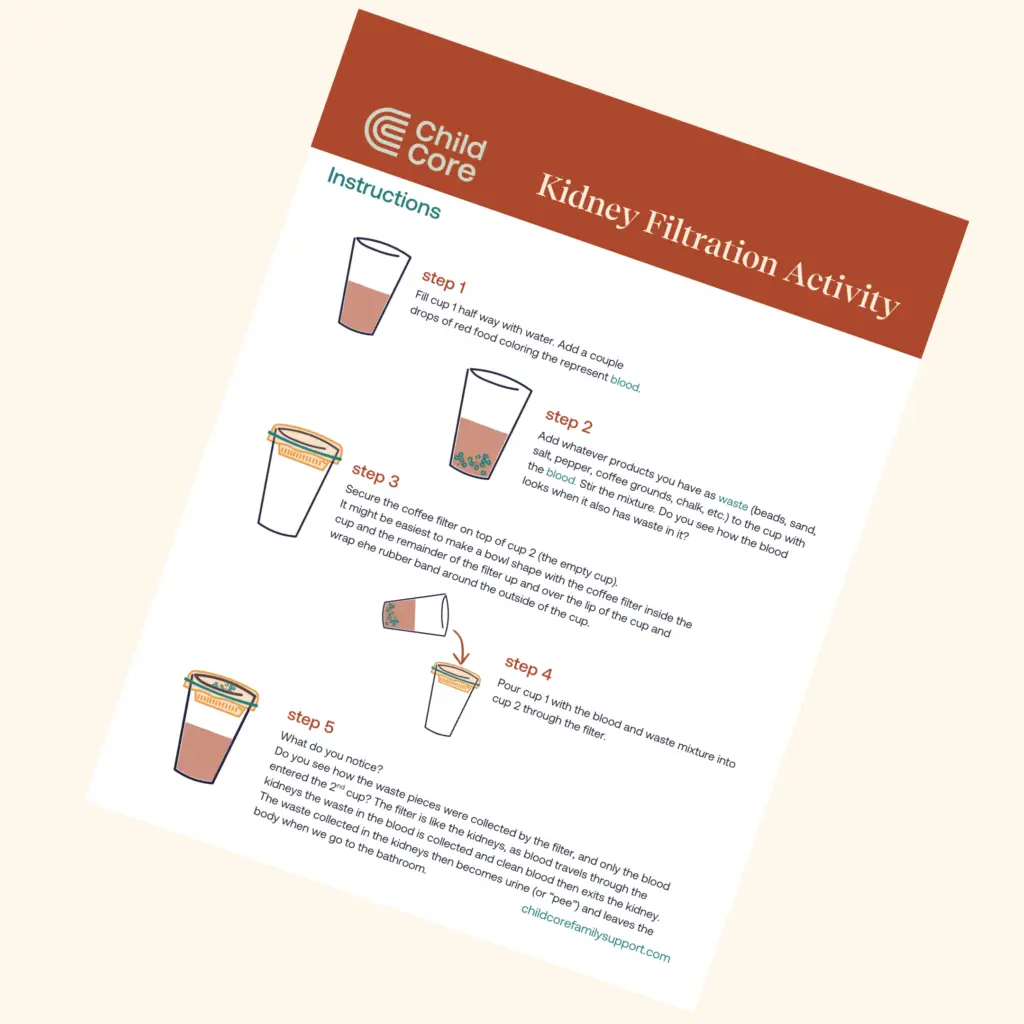 This activity engages children in learning about blood, the fluid and waste the blood collects that the body no longer needs, and how our kidneys help to “clean” the blood and remove the extra fluid and waste. The goal of this activity is to provide an opportunity for children to learn about our kidneys through play and hands-on manipulation.
