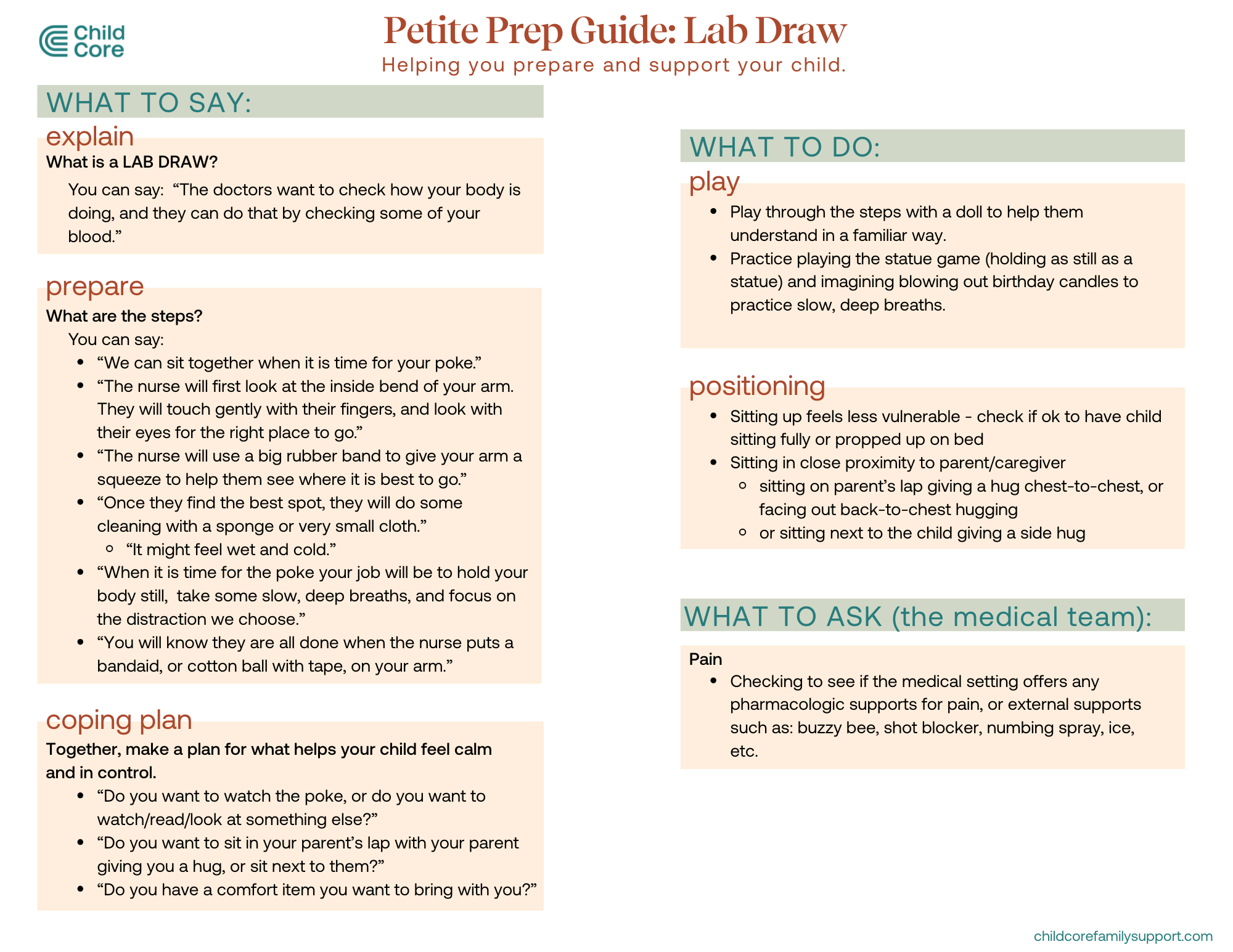 Lab Draws can be tough at any age, but creating a routine, having opportunities for control, and prepping/processing through play, can help set a child up to master their experience. See the resources below to learn how to support your child through a lab draw.